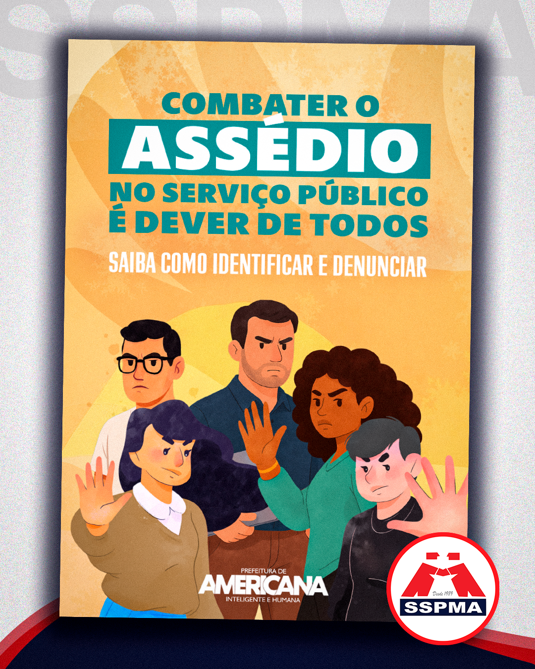 A Prefeitura de Americana está com uma nova campanha contra o assédio no serviço público. O SSPMA apoia e divulga a ação com o objetivo de divulgar aos Servidores públicos municipais as principais informações sobre o tema, assim como o canal de denúncia disponível. É importante todos acessarem a nova cartilha desenvolvida e tirar as principais dúvidas.