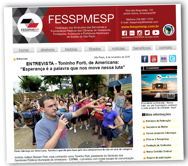 A Federação dos Sindicatos de Servidores de São Paulo (Fesspmesp) entrevistou esta semana nosso presidente Antônio Forti, o Toninho. A equipe de comunicação realizou perguntas relacionadas à sua trajetória de vida e conquistas no Sindicato. Houve espaço também para que dividisse experiências difíceis em todos estes anos.