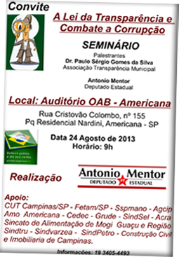 Em razão disso, nosso Sindicato é um dos apoiadores do Seminário "A Lei da Transparência e Combate à Corrupção". O evento será neste sábado, dia 24, às 9 horas, no auditório da OAB de Americana, que fica na rua Cristovão Colombo, 155, Parque Residencial Nardini.