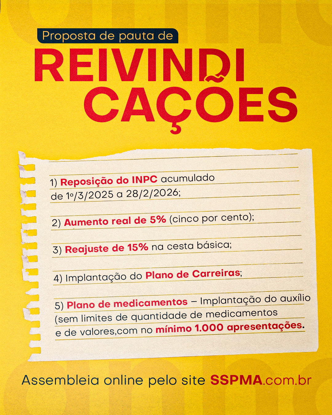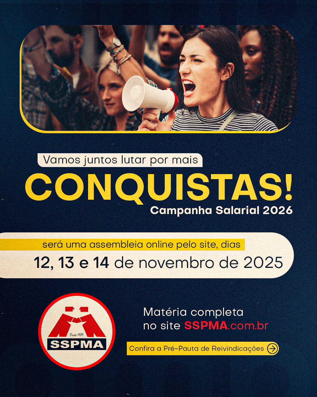 Vamos iniciar a Campanha Salarial 2026 e a participação dos Servidores é fundamental para construirmos uma Pauta de Reivindicações sólida, enxuta e que contemple os principais anseios da categoria. Nós da diretoria do SSPMA já separamos uma pré-pauta com os itens primordiais desta negociação. Além disso, também estamos solicitando a continuidade da negociação dos itens da Pauta de 2025 não atendidos. E faremos tudo de forma democrática: será uma assembleia online, dias 12, 13 e 14 de novembro aqui pelo site. Todos terão voto!