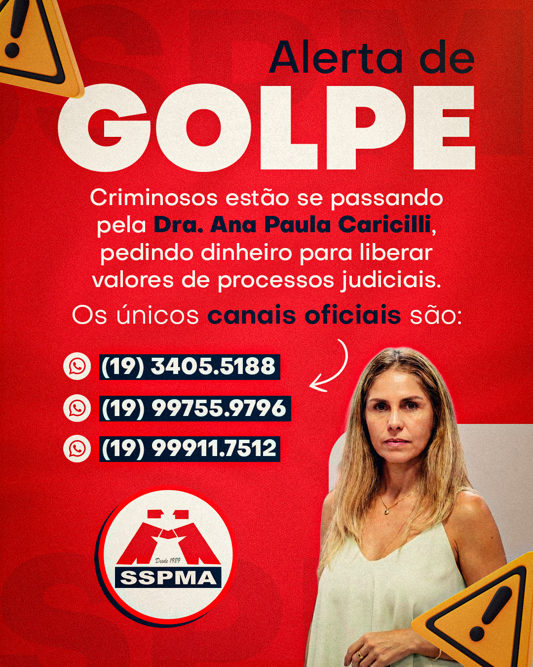 Criminosos estão se passando pela Dra. Ana Paula Caricilli, advogada do SSPMA. Em caso de dúvidas, nos procure!