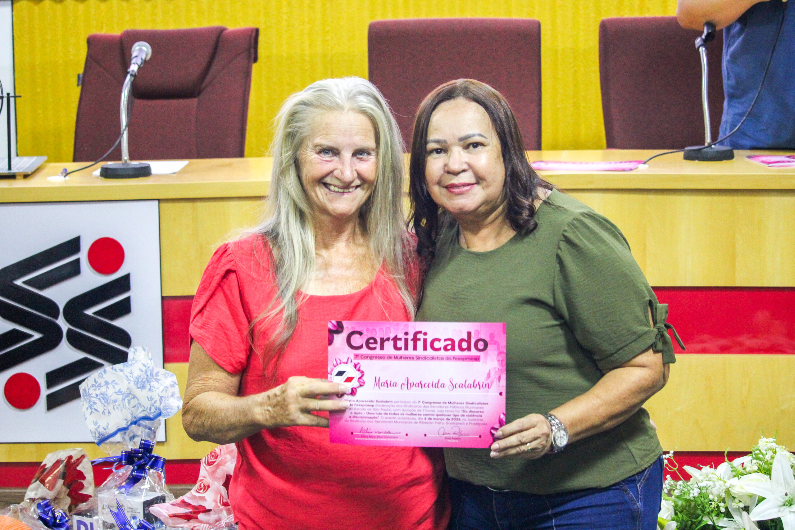 Algumas de nossas diretoras estiveram na última última sexta, dia 6 de março, na cidade de Ribeirão Preto. Elas representaram a entidade no 7º Congresso de Mulheres Sindicalistas da Fesspmesp (Federação dos Sindicatos dos Servidores Públicos Municipais do Estado de São Paulo). Uma oportunidade para celebrar a o Dia das Mulheres com uma reflexão da luta pelo empoderamento feminino contra a violência e todos os tipos de assédio.