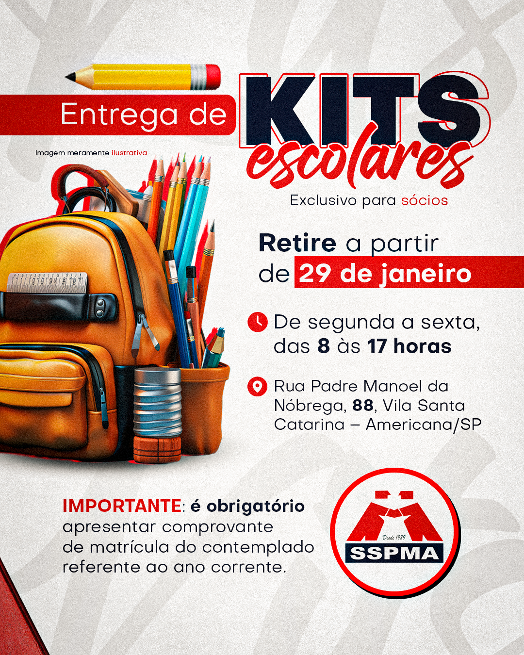 Entrega dos Kits Escolares 2026 | Sócio cadastrado: venha retirar o seu a partir de quinta, 29 de janeiro, na sede do SSPMA