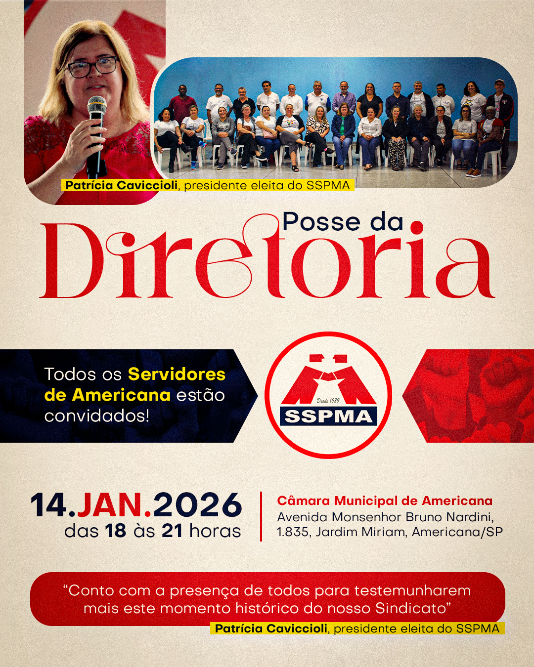 O Sindicato dos Servidores Públicos Municipais de Americana (SSPMA) convida toda a categoria para um momento ímpar e democrático: a solenidade de posse da sua nova diretoria. O evento marca o início de uma nova gestão e será realizado no dia 14 de janeiro, uma quarta, das 19 às 21 horas, no plenário da Câmara Municipal (avenida Monsenhor Bruno Nardini, 1.835, Jardim Miriam). Esta será uma celebração de portas abertas, reforçando o compromisso com a total transparência e a participação popular.