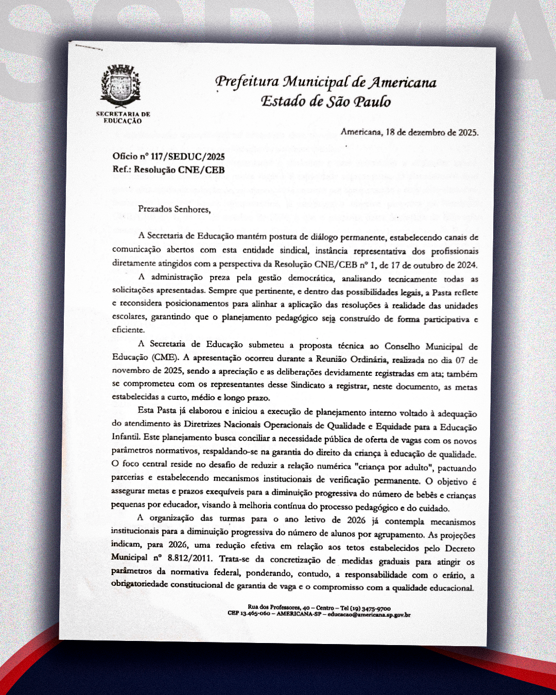 “O que está formalizado é uma tratativa relevante, fruto da nossa pressão e do diálogo com a Secretaria. Mas é fundamental deixar claro que isso não fecha as negociações. A resolução federal não tem força de lei, e o Sindicato vai continuar cobrando, ano após ano, que a redução do número de alunos por sala avance ainda mais. Vamos estar sempre vigilantes para reorganizar essas metas sempre que possível, garantindo que a melhoria seja contínua e que a qualidade do ensino seja prioridade”, afirmou.
