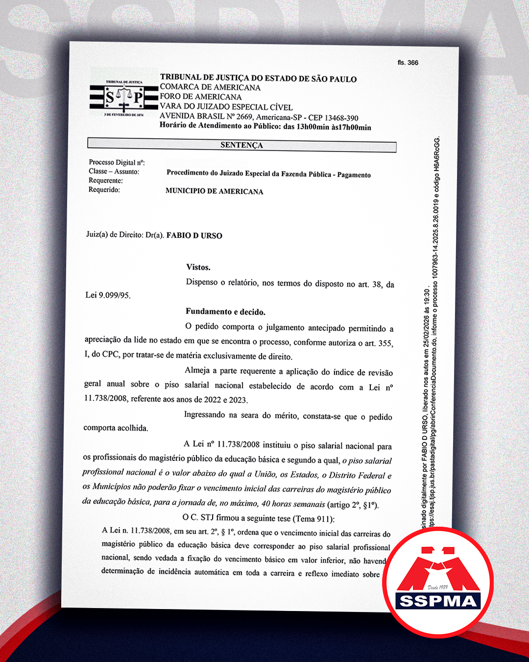Em decisão publicada no último dia 26 de fevereiro, a Vara do Juizado Especial Cível da Comarca de Americana julgou procedente ação patrocinada pelo Sindicato dos Servidores Públicos Municipais de Americana (SSPMA) em favor de uma profissional do quadro de Auxiliares de Desenvolvimento Infantil (ADI). A sentença reconhece o direito à aplicação cumulativa da revisão geral anual sobre o Piso Salarial Nacional do Magistério, referente aos exercícios de 2022 e 2023, abrindo precedente para que outros Servidores da mesma carreira busquem idêntico reconhecimento.