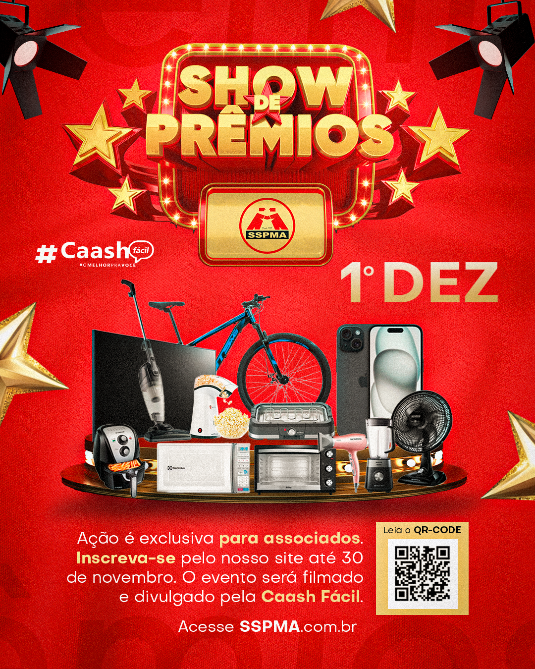 O SSPMA e a Caash Fácil promovem, pela primeira vez, o “Show de Prêmios”, iniciativa especial para os nossos associados. A ação celebra o Mês do Servidor e é um agradecimento aos sócios e concede a chance de ganhar itens de alto valor, como um iPhone 15, além de diversos eletrodomésticos e eletrônicos, totalizando mais de R$ 10 mil em prêmios. Uma oportunidade imperdível para quem já é parte ativa da família SSPMA.